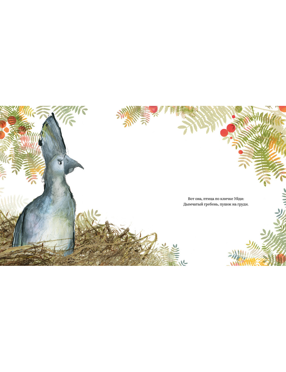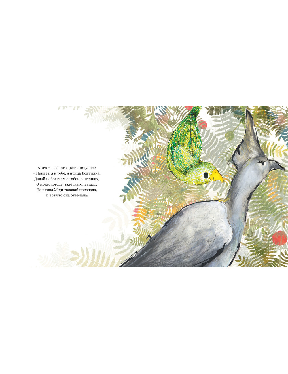 другой к ней на дерево подсаживаются птички и зовут полетать, поклевать ягоды или просто поболтать. Однако неприветливая птица лишь мотает головой и прогоняет их прочь. Но однажды в небе появляется огромная, тёмная – хищная птица…