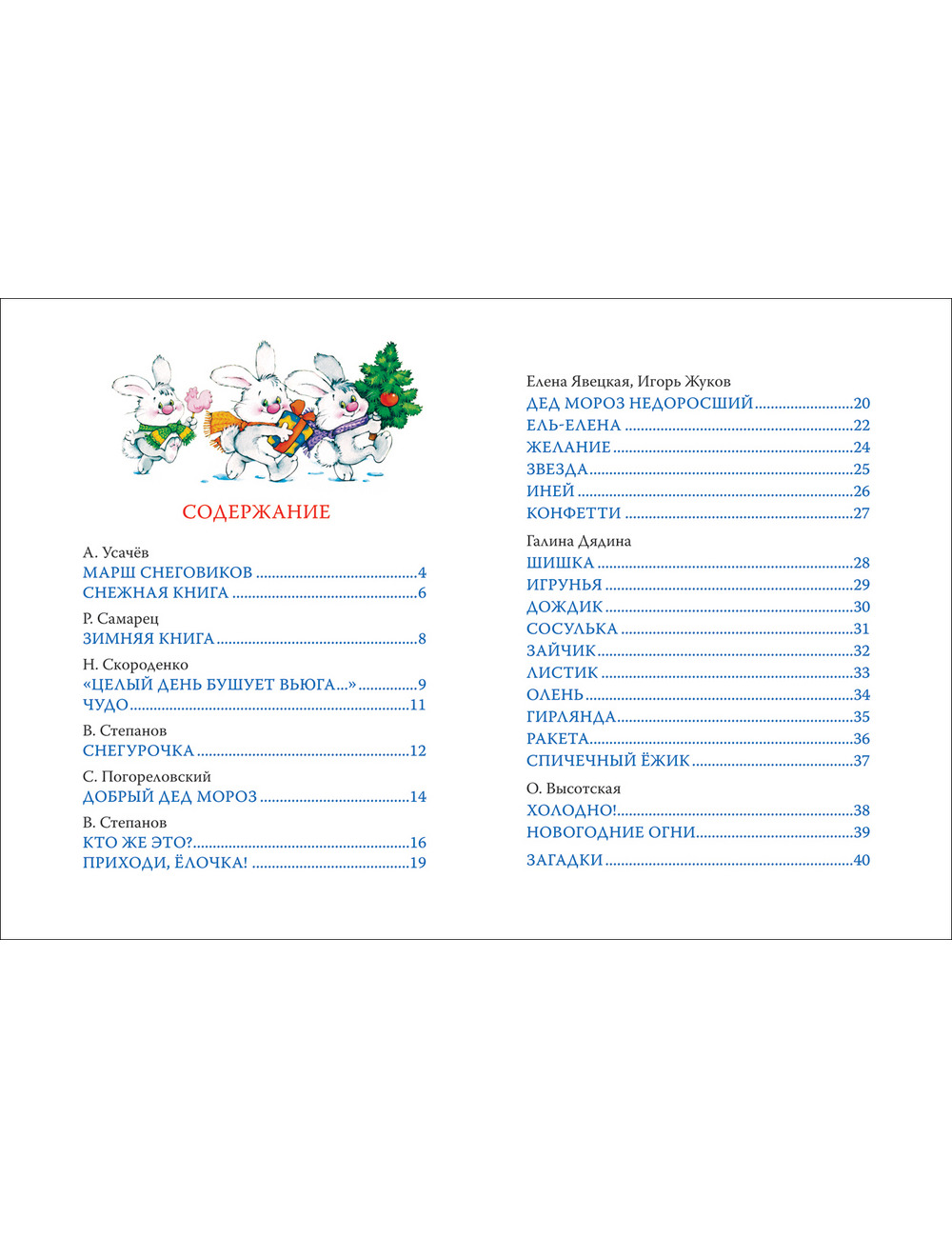 В сборник вошли самые любимые зимние стихи А. Усачева, Я. Явецкой, И. Жукова, Г. Дядиной и других авторов. А также веселые детские загадки про зиму и про Новый год.