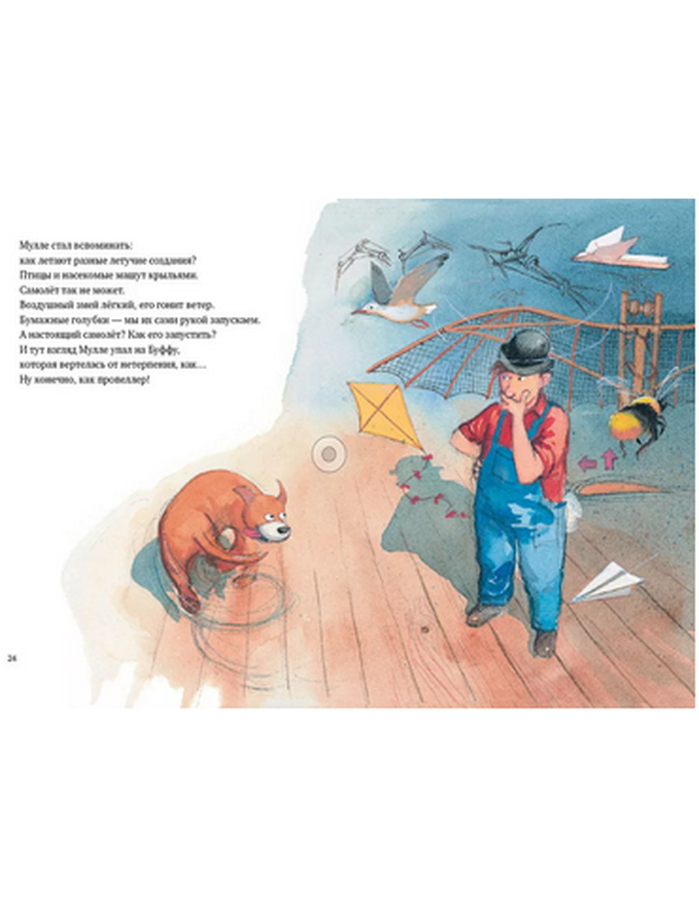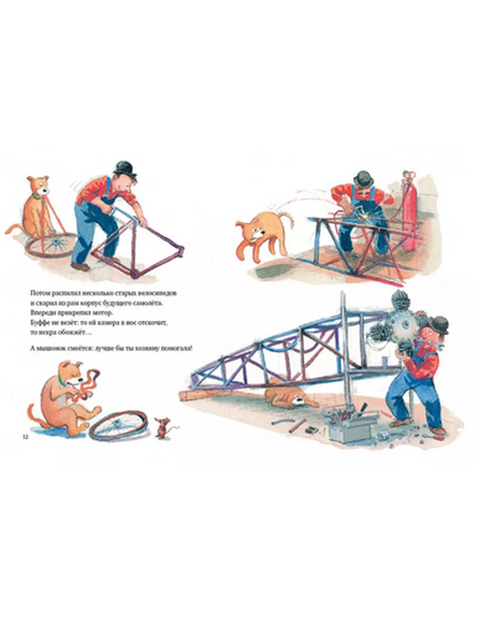 Мулле вместе со своей собакой Буффой долго путешествовали по свету – сначала на автомобиле, потом на лодке. И вот приплыли они к незнакомому скалистому берегу, и там попадается им заброшенная мастерская по ремонту велосипедов. Кругом железяки разные, болтики ржавые и прочий хлам. Никак не может пройти Мулле мимо такого богатства! Подумали они с Буффой, подумали, да и решили самолёт сделать, чтобы побыстрее домой вернуться.
