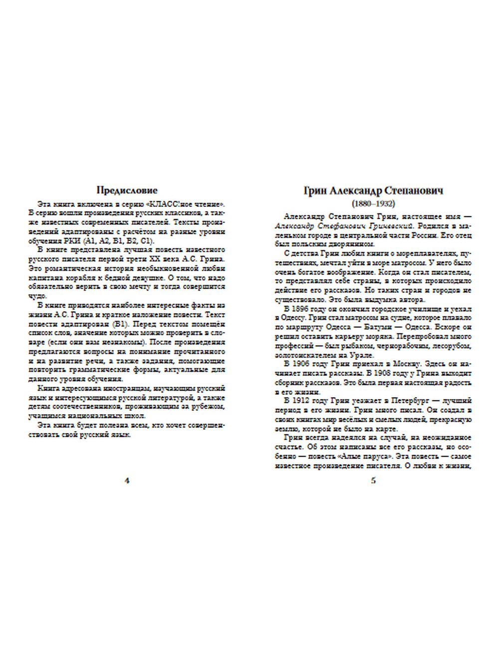 Текст повести адаптирован (B1), сопровождается заданиями на понимание прочитанного и на развитие речи. В книге приводятся наиболее интересные факты из жизни Грина и краткое изложение повести.