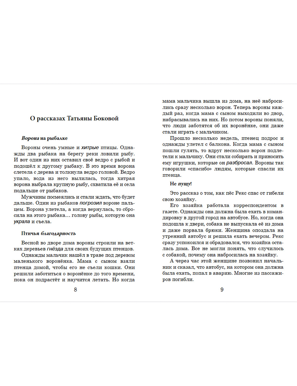 В книге представлены истории о животных современной писательницы Татьяны Боковой. У всех героев рассказов своя история. Это разумные существа. Они очень хорошо чувствуют и понимают людей и других животных. Собака может дружить с котом и даже с дельфином. Вороны умные и хитрые птицы. А слон в цирке узнал во взрослой женщине ту девочку, с которой дружил двадцать лет назад, и... подарил ей банан. Текст рассказов адаптирован (А2), сопровождается заданиями на понимание прочитанного и на развитие речи. В книге приводятся наиболее интересные факты из жизни Боковой и краткое изложение рассказов.